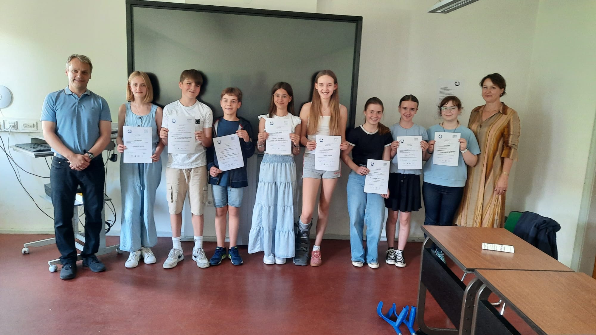 Und so recherchierten, forschten und schrieben sechs Schülerinnen und zwei Schüler, um im Mai eine mehrseitige Arbeit einzureichen. Nun zum Ende des Schuljahres haben diese Schüler*innen einen PowerPoint-Vortrag zu ihrem Thema gehalten. Sie beeindruckten mit großen Sachkenntnissen und einem souveränen Auftreten bevor ihnen Schulleiterin Nina Papajewski die wohl verdienten Urkunden überreichte. Unterstützt wurden sie während des FFP vom Projektleiter Jonas von Moritz.