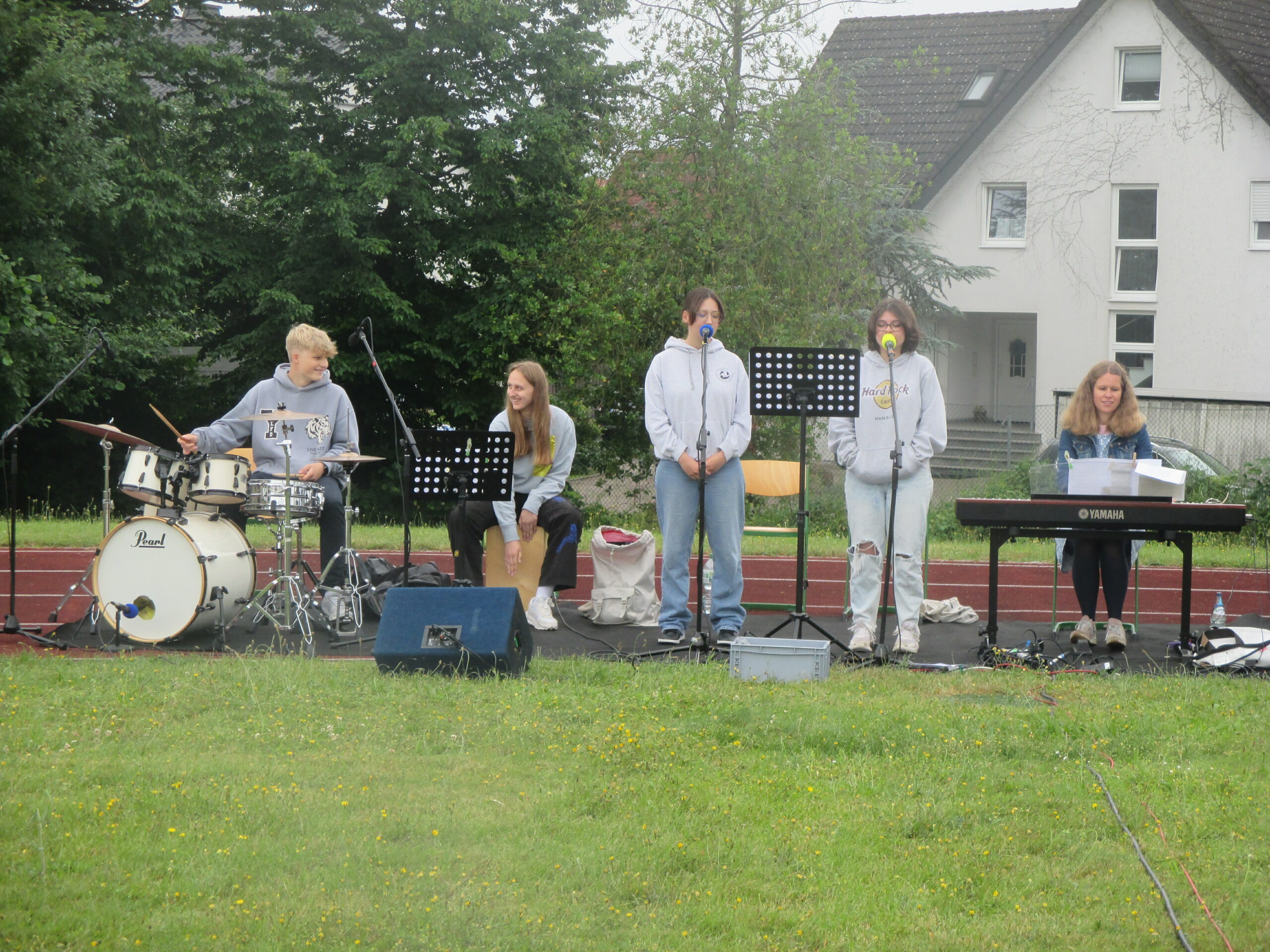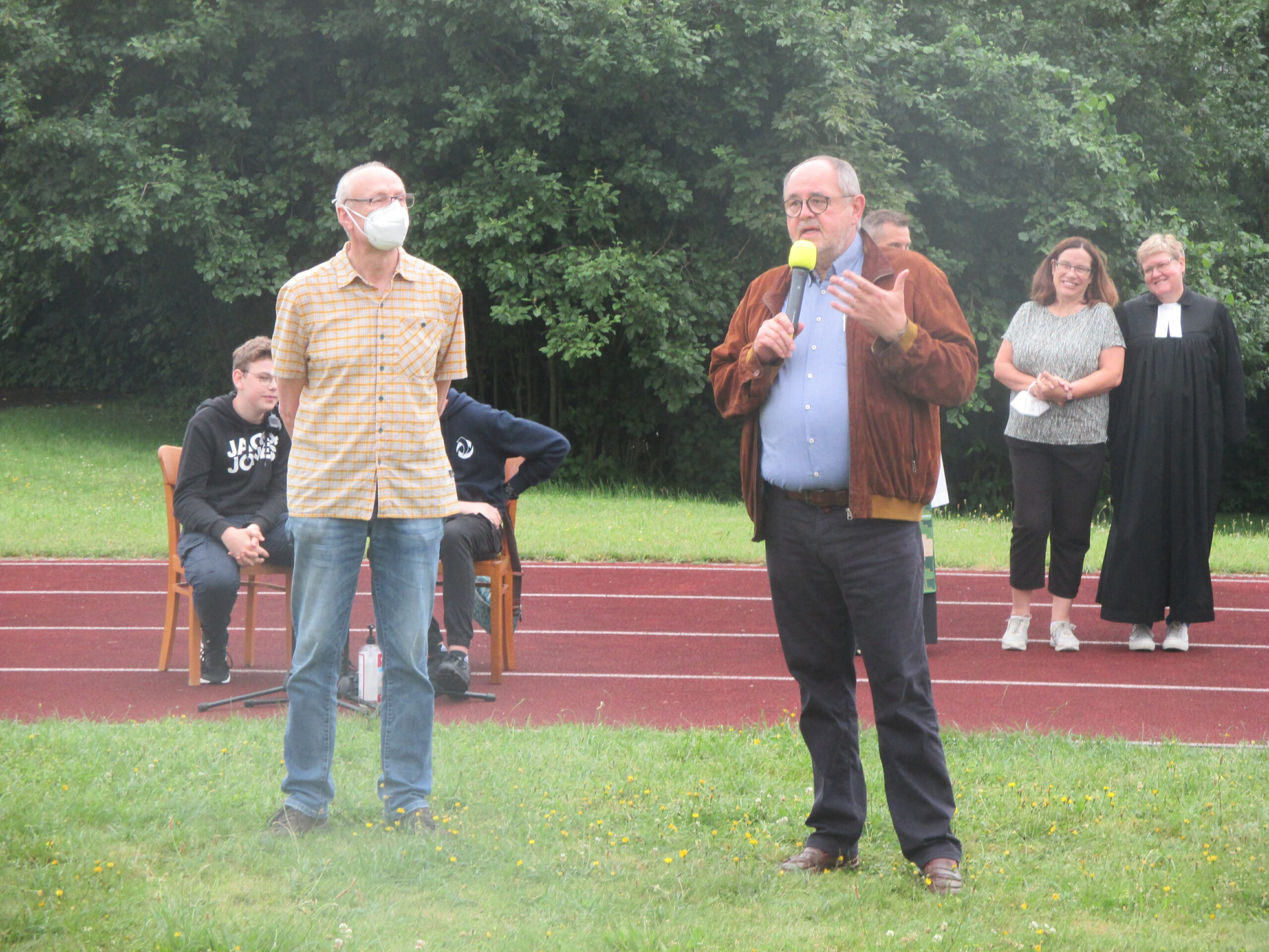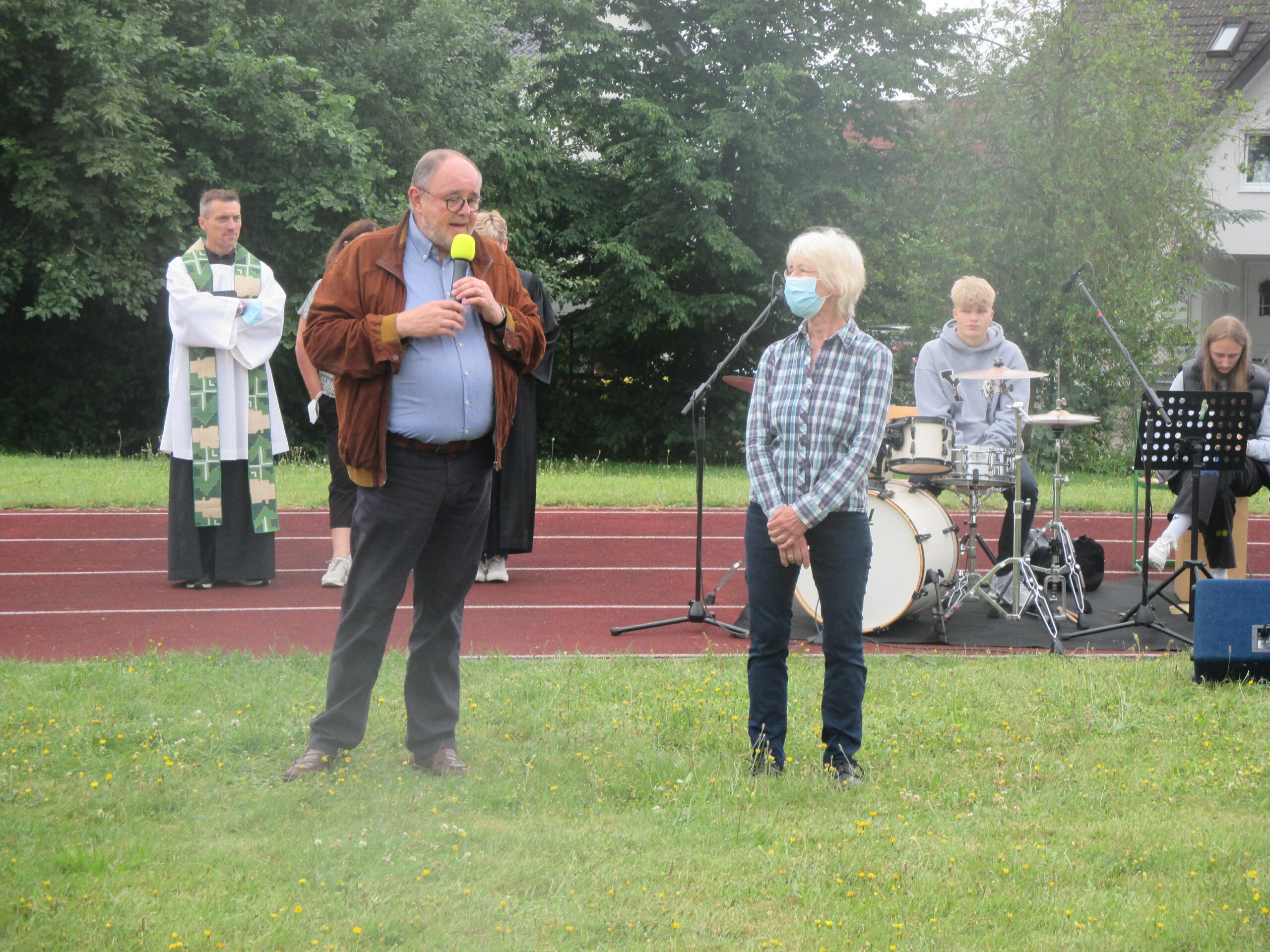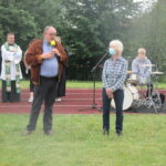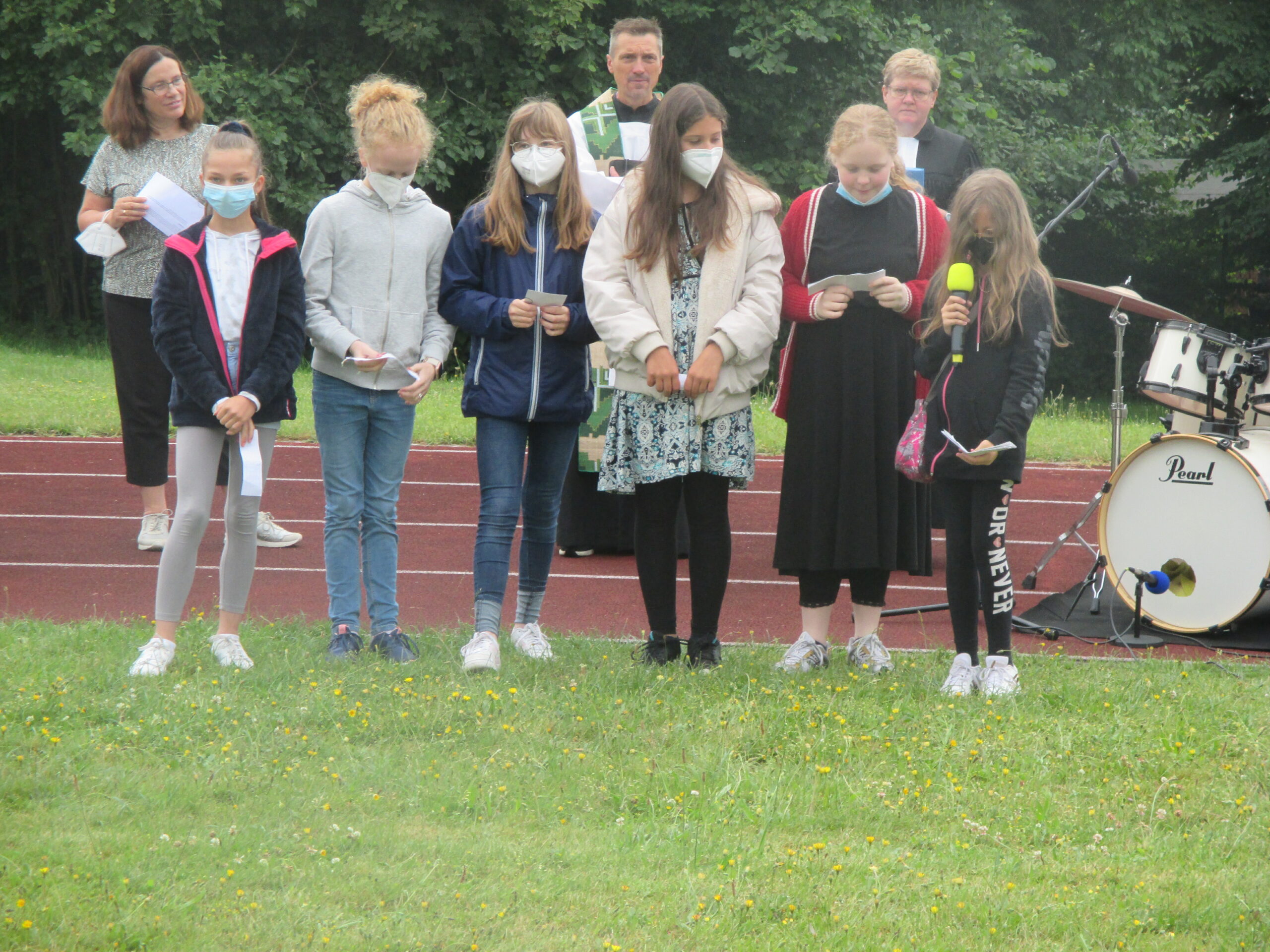 Das Wetter hat zum Glück mitgespielt, so konnten wir heute vor dem Austeilen der Zeugnisse den alljährlichen Abschlussgottesdienst vor den Sommerferien im Freien begehen. Frau Pastorin Stille, Frau Welle und Pfarrer Matuschek haben den Gottesdienst gestaltet und wurden dabei tatkräftig von einer Schülerband unter der Leitung von Frau Möller und Mitgliedern der Tontechnik-AG unterstützt. In seiner Ansprache ermunterte Herr Matuschek alle, nicht nur an die negativen Dinge, die das Schuljahr und die Pandemie mit sich brachten, zu denken, sondern auch stets für das Positive, das sich aus mancher Entwicklung ergeben hat, offen zu sein. Schüler*innen der Klasse 6d trugen dafür ganz persönliche Beispiele vor. Am Ende des Gottesdienstes hat Schulleiter Günter Kunert die Kollegin Waldhelm (Biologie und Geschichte/Politik) und den Kollegen Schulte-Nölle (Mathematik und Physik) in den Ruhestand verabschiedet und ihnen für ihren jahrzehntelangen Einsatz an der Marienschule gedankt. Die Schüler*innen drückten ihren aufrichtigen Dank durch einen langen Applaus aus. Ebenso werden mit Ende des Schuljahres Frau Manke (Deutsch, katholische Religion und Musik) und Frau Funhoff (Deutsch und Latein) ihren Ruhestand antreten. Wir danken allen vier Kolleginnen und dem Kollegen für ihren prägenden Einsatz an der Marienschule, ihr Engagement in den jeweiligen Fachschaften und für ihren Einsatz . Wir wünschen ihnen einen guten Start in den Ruhestand!