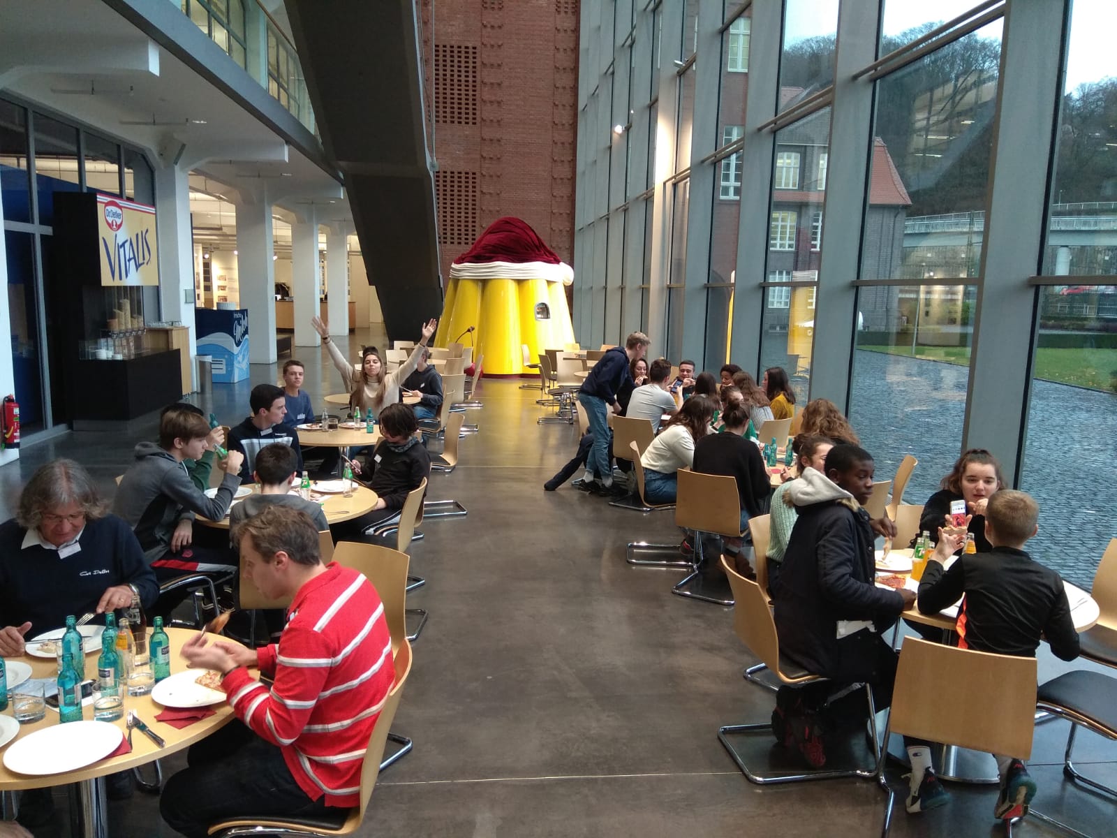 Nach dem Wochenende, das die französischen Gäste mit ihren Gastfamilien verbracht haben, begann am Montag wieder ein ganz „normaler“ Schultag. Dieser endete jedoch schon nach der 2. Stunde, da wir dann gemeinsam den Film „Good bye, Lenin“ geschaut haben, der uns auf die anschließende Projektarbeit und auch auf die Berlin-Fahrt am nächsten Tag eingestimmt hat. Nach einem Mittagessen in der Mensa fuhr dann die französische Gruppe zu einem Rundgang in die Dr. Oetker-Welt. Geführt von einem französischsprachigen Kanadier lernten wir dann viel Interessantes über die Geschichte von Dr.Oetker kennen, das Beste war jedoch die anschließende Kostprobe von Pizza, Baguette und Pudding. Um 17.00 Uhr war das Programm zu Ende und die Gastfamilien sammelten ihre französischen Gäste am Schulhof der Marienschule wieder ein.