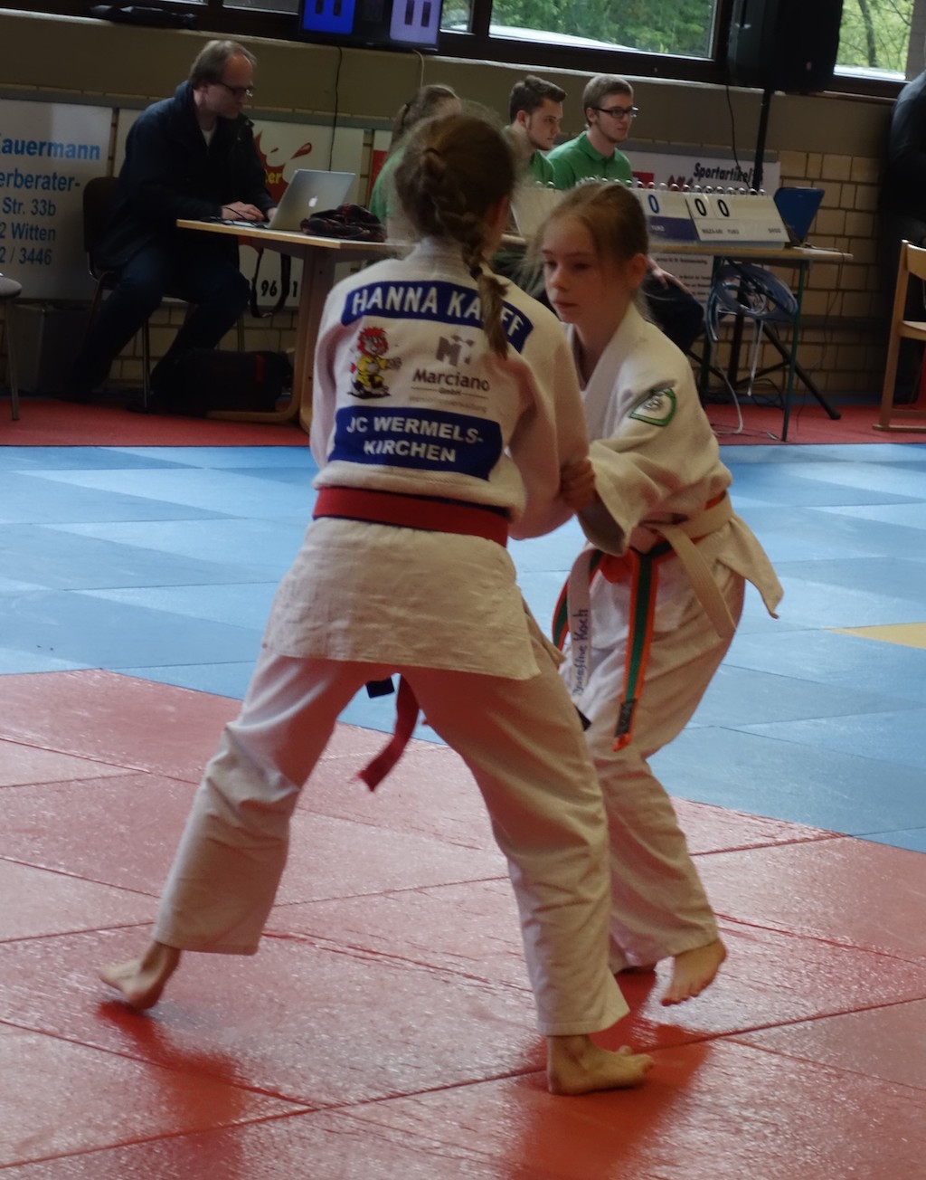 Trotz Abiturbelastung betreuten Josefine Koch und Sebastian Grimm die Mannschaft auch auf dieser Ebene und wurden Zeugen eines spannenden Wettkampftages. Gleich zu Beginn mussten die Marienschülerinnen jedoch zunächst zwei schlechte Nachrichten hinnehmen – wegen der Verletzung von Merle Beier aus den Bezirksmeisterschaften und dem geringfügigen Überschreiten einer Gewichtsgrenze konnten zwei von fünf Gewichtsklassen nicht besetzt werden. Das hatte zur Folge, dass jeder Gegner, der in diesen Gewichtsklassen eine Teilnehmerin stellen konnte, hier automatisch als Sieger feststand. Von fünf möglichen Siegen gingen also schon vor Wettkampfbeginn zwei an die jeweils gegnerische Schule.