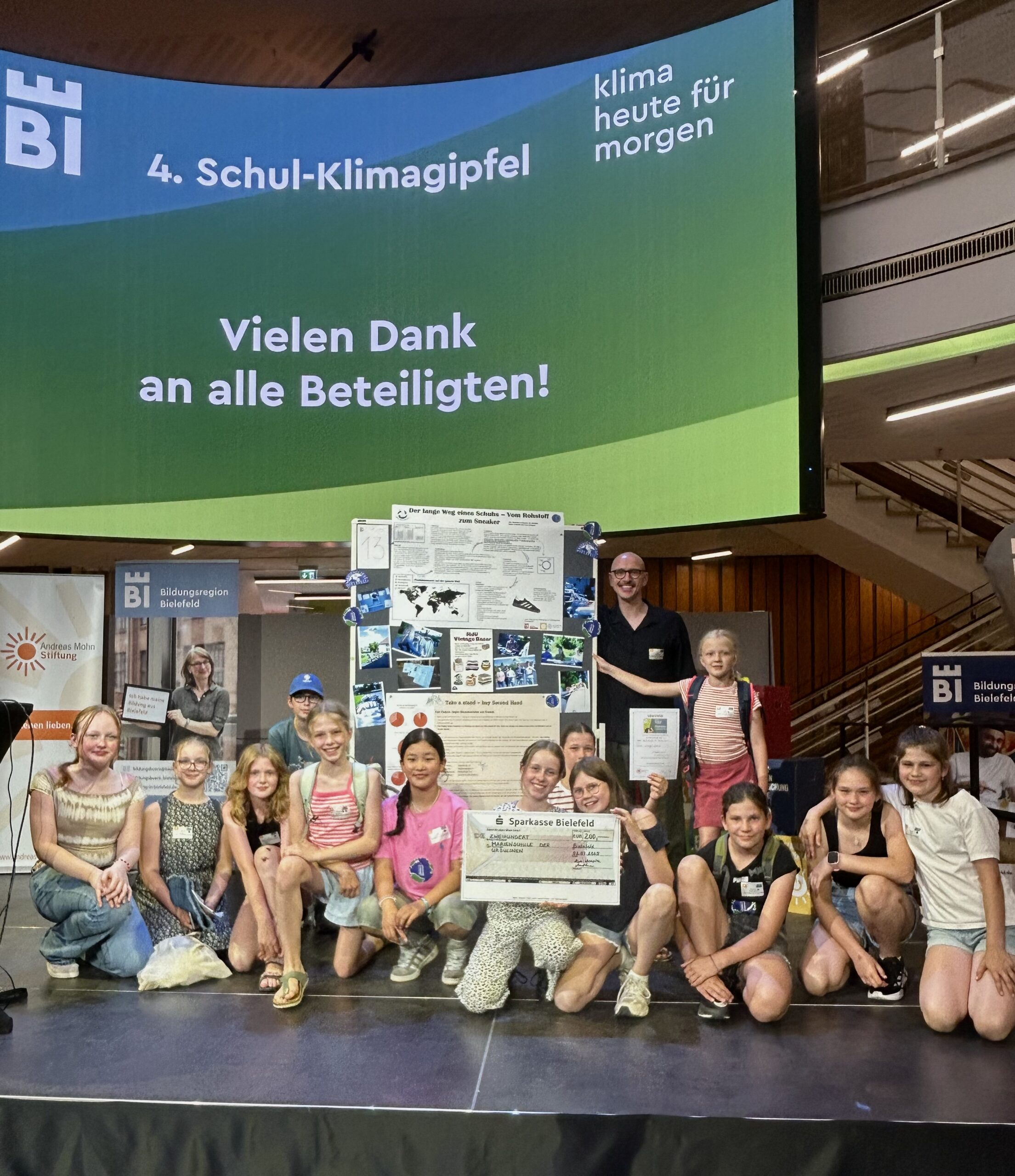 Am Mittwoch, den 2. Juli, nahm die Klima-AG der Marienschule engagiert am 4. Schul-Klimagipfel der Stadt Bielefeld in der Wissenswerkstadt teil und durfte sich über eine besondere Auszeichnung freuen: Beim Publikumspreis erreichten unsere Schülerinnen und Schüler einen hervorragenden dritten Platz und erhielten dafür ein Preisgeld in Höhe von 200 Euro.