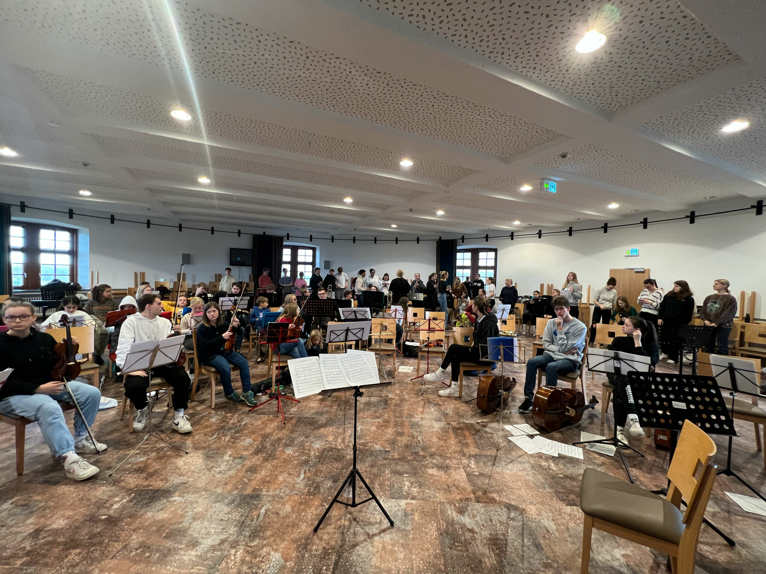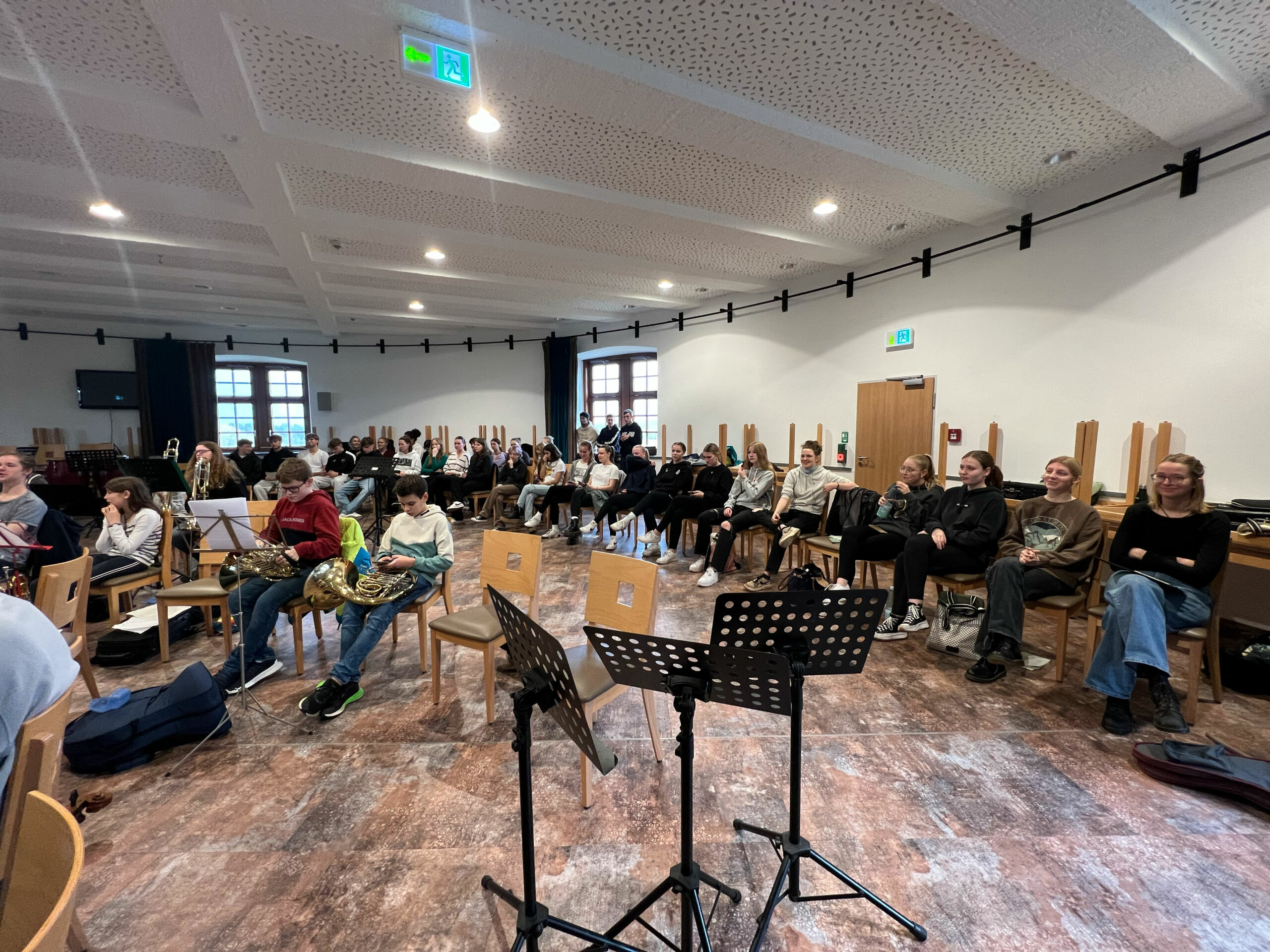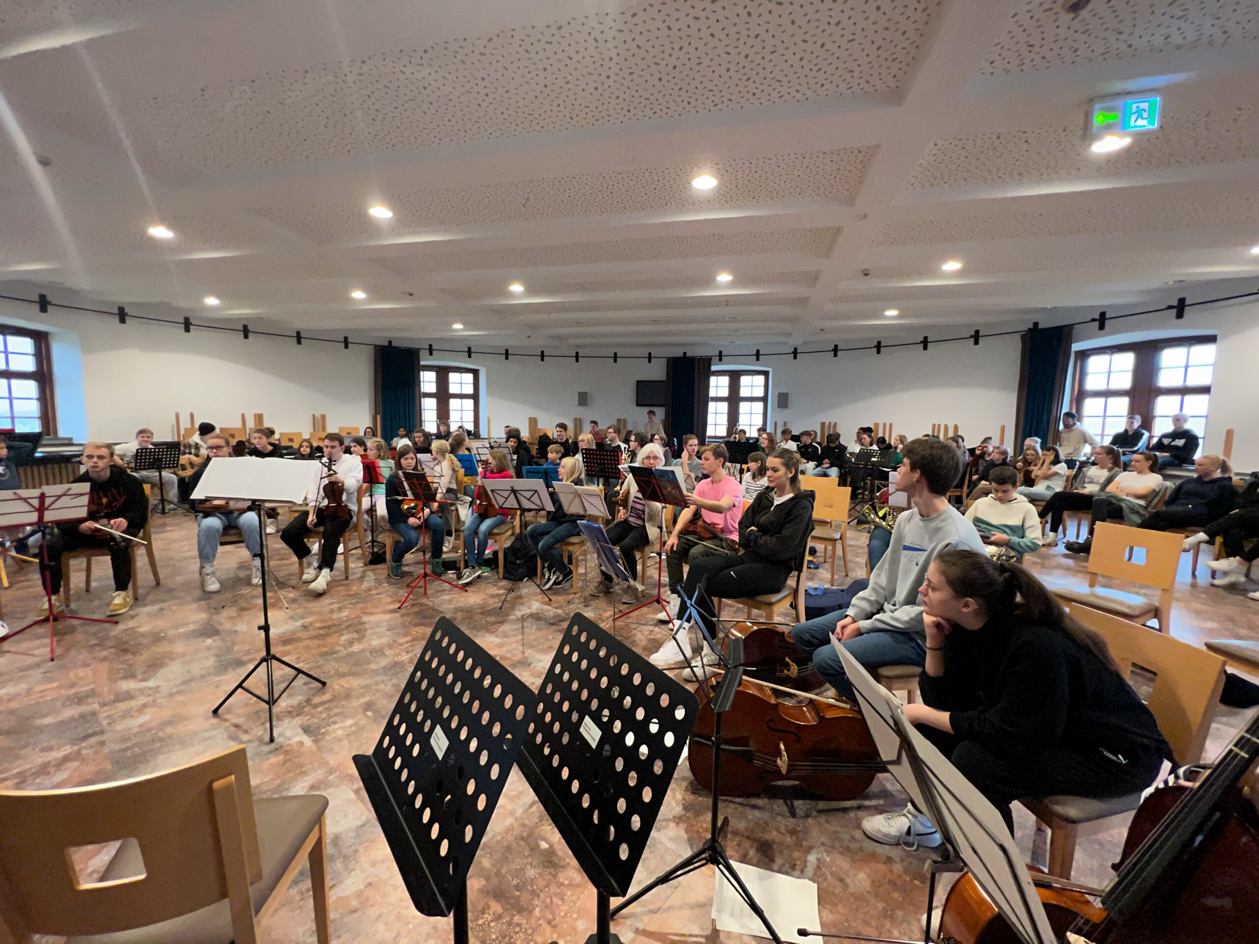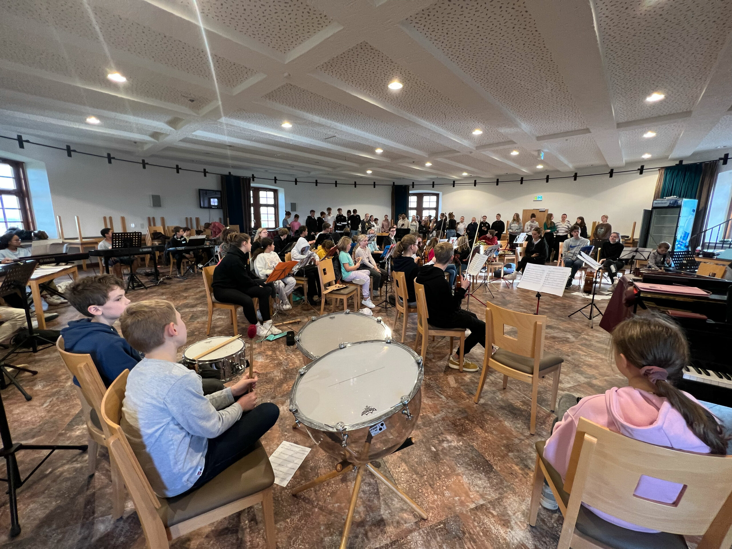 Angekommen im Paderborner Land wurden Koffer, Taschen und jede Menge Instrumente nach oben in die Burg getragen und auf die Probenräume verteilt, so dass es direkt losgehen konnte mit einer intensiven musikalischen Zeit. Neben vielen Probephasen durften Pausen, Spiele, Gespräche und natürlich die legendäre Nachtwanderung am Dienstag Abend – vorbereitet vom Jg Q2 – nicht fehlen. Gerade die jüngeren Musiker*innen gruselte es schon ein wenig, als die Q2 sie hier und da im Dunkeln erschreckte.